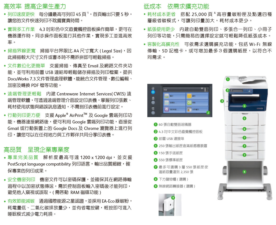 黑白雷射多功能複合機(jī)擁有快速的列印速度、優(yōu)異的輸出 品質(zhì)、及客製化的擴(kuò)充能力,能為您的事業(yè)增添效率並展現(xiàn)專業(yè)。