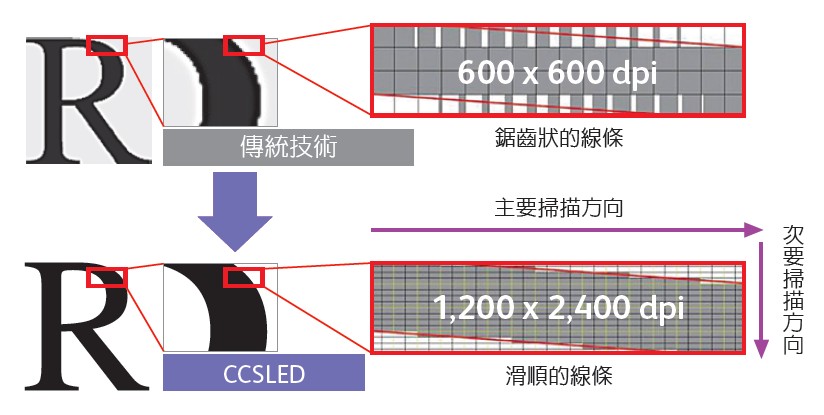 • 快速色彩修正 IReCT 影像定位控制技術(shù),以超精細的畫素控制精準修正失真的影像,將畫素填入縫隙中,使鋸齒狀的邊緣更加平滑,提升個別字元與細線的列印品質(zhì)。
